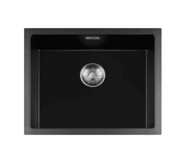 Zwarte quartz spoelbak met ronde korfplug.